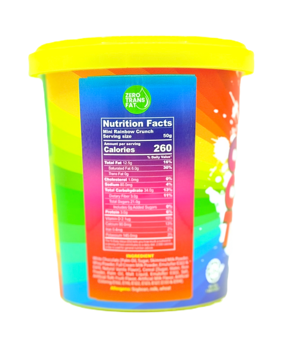 Mini Rainbow Crunch: Colorful, crispy rainbow cereal coated in creamy white chocolate